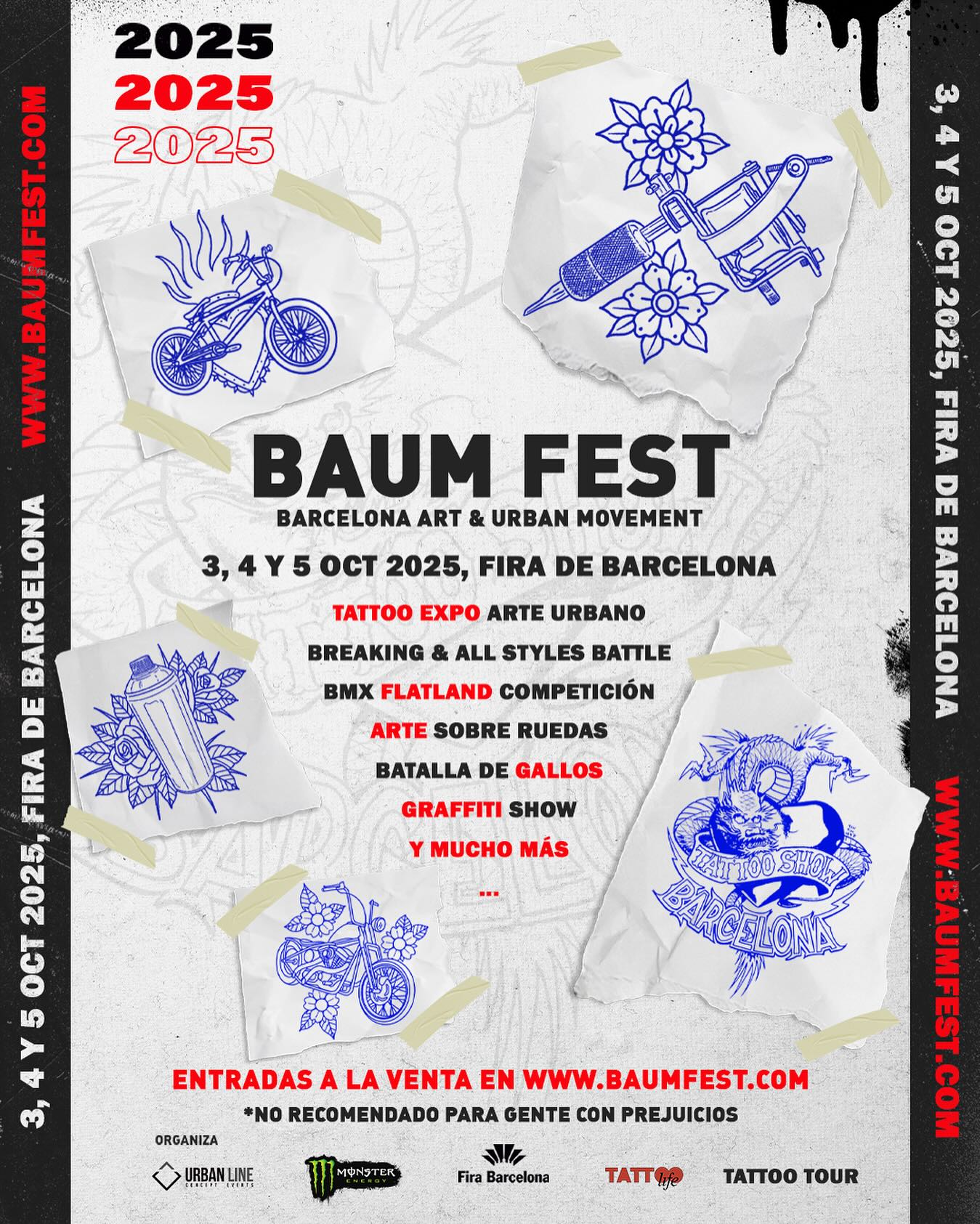 Los días 3, 4 y 5 de octubre, el recinto de Fira de Barcelona, Plaza España, se convertirá en el epicentro del tatuaje, el arte urbano y la cultura alternativa con una nueva edición del *BAUM Fest – Barcelona Tattoo Expo*. Este año, el festival se reinventa con un enfoque más didáctico y profesional, brindando al público la oportunidad de apreciar más de 1.000 obras de arte en soportes tan diversos como piel, lienzo, cuero, metal y ropa.