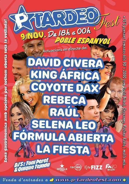 Aquest dissabte 9 de novembre de les sis de la tarda fins a les dotze de la nit, el Poble Espanyol de Barcelona acollirà la festa més boja de l’any: el P-TARDEO Fest.![]() Tindrem en directe les actuacions de David Civera (“Dile que la quiero”, “Que la detengan”, “Bye, bye”, “Rosas y espinas”…), King Africa (“La Bomba”, “Mamá yo quiero”, “Paquito el chocolatero”…), Coyote Dax (“No Rompas mi corazón”, “Johny Boy”, “Me vale”…), Rebeca (“Duro de pelar”, “Sólo amante”, “Corazón, corazón”…), Selena Leo (“Yo quiero bailar”, “Tequila”, “Que viva la noche”…), Raúl (“Sueño su boca”, “Prohibida”, “As de corazones”…), Fórmula Abierta (“Te quiero más”, “Ay morena”, “Mi cruz y mi fe”…), La Fiesta (“La canción del velero”, “Toma vitanima”…) i festassa final amb la sessió de Toni Peret i Quique Tejada (“Max Mix”, “Dream Team”…). | |