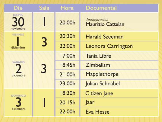 Pròximament s’anunciarà els presentadors d’“Eva Hesse”, sobre l’escultora post-minimalista Eva Hesse, coneguda pel seu treball pioner amb materials com el làtex, la fibra de vidre i els plàstics (la première del documental es va realitzar en el Whitney Museum de New York), “Maurizio Cattelan: Be Right Back”, una pel·lícula sobre el controvertit artista italià Maurizio Cattelan, i “Leonora Carrington: the lost surrealist”, la història de la pintora surrealista anglesa Leonora Carrington.