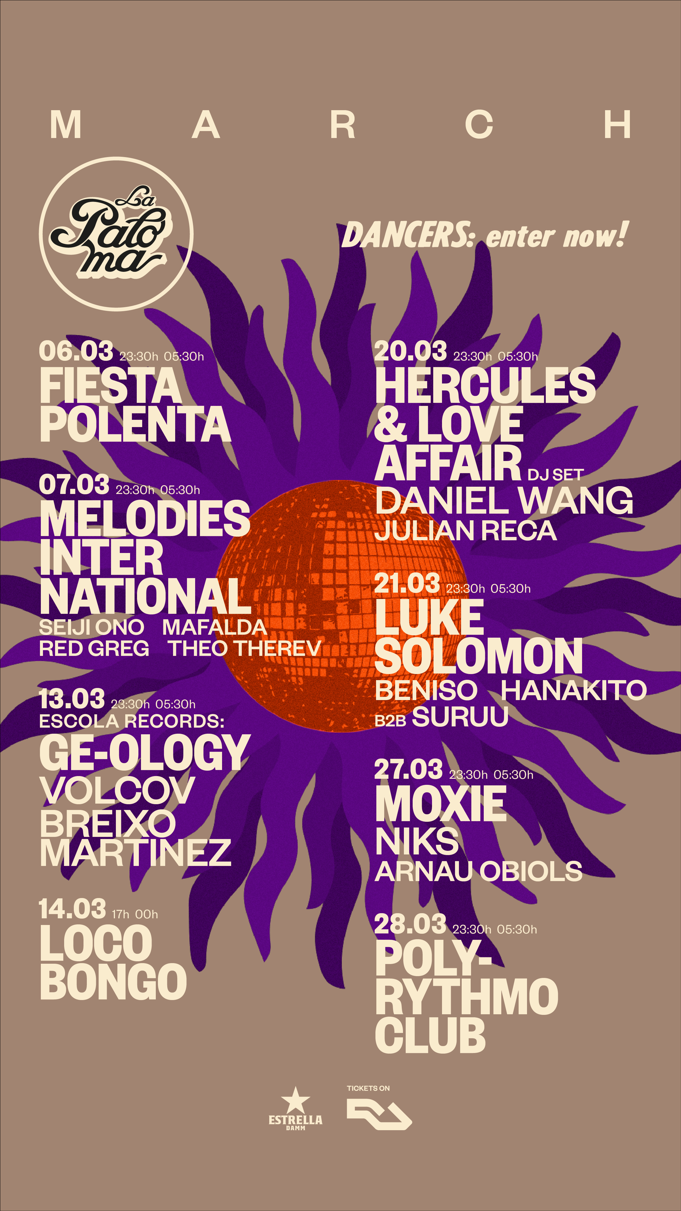 La Paloma da inicio al mes de marzo con una programación renovada y protagonizada por figuras de la talla de Hercules & Love Affair y Luke Solomon, consolidándose como epicentro cultural de la música electrónica en Barcelona. La histórica sala de baile del Raval, reconocida como la más antigua de Europa, presenta una agenda que celebra el arte del crate digging y explora sonoridades disco, house y ritmos underground, al tiempo que adelanta una contundente temporada de primavera con artistas internacionales de renombre.![]() Una inmersión en el digging transatlántico El telón se levanta el 7 de marzo con el esperado showcase de Melodies International, el icónico sello liderado por Floating Points, destinado a desenterrar tesoros olvidados de soul, disco y rare grooves. La cita promete una experiencia sonora única con una destacada alineación de DJs: Red Greg, Mafalda, Seiji Ono y la revelación Theo Terev. En un formato especial b2b extendido durante toda la velada, estos maestros del mezclador tejerán una narrativa musical impredecible y cautivadora. El espíritu del digging dará continuidad el 13 de marzo con la llegada de GE-OLOGY desde Brooklyn, un virtuoso capaz de fusionar jazz, house, funk y sonidos tradicionales con su sensibilidad musical única. Acompañado por Volcov, referente del underground europeo, y Breixo Martínez, residente de Canela En Surco con un marcado estilo curatorial, la noche promete dejar una huella imborrable. La esencia viva del house y el vigor del pop-disco El 20 de marzo será el turno de Hercules & Love Affair, el conocido proyecto liderado por Andy Butler que desplegará su propuesta de house pop cargado de emoción y sofisticación disco. Entre los momentos destacados estará el regreso del inimitable Daniel Wang, quien vuelve para regalar una experiencia sideral a través de su distintivo disco romántico. Julian Reca abrirá la noche con sus elegantes beats house para preparar el terreno a un encuentro celestial entre la cabina y la pista. Al día siguiente, el 21 de marzo, Luke Solomon, figura clave del house británico y cofundador del icónico sello Classic Music Company, tomará las riendas. Su set promete conectar décadas de soul y disco con una técnica impecable. Lo acompañarán Beniso, con su magnetismo contemporáneo, y Hanakito b2b Suruu, quienes ofrecerán un inicio marcado por paisajes sonoros profundos y envolventes. La recta final del mes estará liderada por Moxie el 27 de marzo. Considerada una de las selectors más eclécticas del Reino Unido, su capacidad para navegar entre estilos como house, techno e influencias puramente underground será el atractivo principal. Asimismo, contará con la presencia electrizante de Niks como artista seleccionada personalmente para acompañarla en esta velada que también incluirá el toque inconfundible de Arnau Obiols y su propuesta entre house y disco. La oferta se complementa con otras citas imprescindibles como Fiesta Polenta (6 de marzo), el audaz espectáculo Loco Bongo (14 de marzo) y una nueva edición del Poly-Rythmo Club (28 de marzo). Expectativas altas para abril y mayo Con vistas al futuro, La Paloma comienza a perfilar una temporada primaveral repleta de estrellas internacionales. El mes de abril iniciará con un huracán musical liderado por Omar S, ícono del sonido crudo e independiente nacido en Detroit. Otros nombres como Nightmares on Wax, Kai Alce, El Búho, COEO y Dimitri from Paris aseguran noches inolvidables en los próximos meses. Desde su apertura en 1903, La Paloma ha sido mucho más que una sala; es un punto neurálgico para la música y el baile. Este 2026 promete consolidar aún más su legado como referente global en la escena clubber mientras sigue ofreciendo experiencias cargadas de historia e innovación sonora. Entradas ya disponibles en Resident Advisor y lapaloma.com. Marzo en La Paloma 6 de marzo – Fiesta Polenta 7 de marzo – La Paloma meets Melodies International w/ Red Greg 13 de marzo – La Paloma pres. GE-OLOGY 14 de marzo – Loco Bongo 20 de marzo – La Paloma presents Hercules & Love Affair (DJ Set) 21 de marzo – La Paloma pres. Luke Solomon 27 de marzo – La Paloma presents Moxie 28 de marzo – Poly-Rythmo Club Acerca de La Paloma En el número 27 de la calle del Tigre, en pleno corazón del Raval, se encuentra uno de los tesoros mejor guardados de la ciudad: La Paloma. Esta emblemática sala de baile, considerada la más antigua de Europa, abrió sus puertas en 1903 y desde entonces ha sido testigo de más de un siglo de historia social y cultural en Barcelona. Tras su fachada industrial, se esconde un interior que evoca el esplendor de Versalles: techos decorados con pinturas, vitrales con acabados artísticos, relieves dorados y una imponente lámpara central que convierten el espacio en un escenario digno del glamour del cine clásico. La pista de baile de La Paloma ha sido transitada por personalidades como Picasso, Dalí, Josephine Baker, Leonardo DiCaprio o Pedro Almodóvar. Pero también ha sido el punto de encuentro favorito de generaciones enteras de barceloneses, quienes han transformado este lugar en un ícono de la vida nocturna gracias a su amor por el baile. A lo largo de los años, La Paloma ha abierto sus puertas a un público diverso, abarcando distintas edades, culturas e identidades. Siempre a la vanguardia, ha sido escenario clave en la evolución musical de la ciudad, destacándose por ser pionera con iniciativas como las sesiones afro-latinas del Bongo Lounge, donde se fusionaban ritmos tradicionales con las tendencias contemporáneas, y albergando incluso los primeros carnavales LGBTQ+. Actualmente, fiel a su esencia y herencia cultural, La Paloma sigue siendo sinónimo de vida nocturna vibrante. Ofrece conciertos semanales de música en vivo y noches inolvidables al ritmo del house y el disco, manteniendo su inconfundible atmósfera que invita a los visitantes a viajar en el tiempo. Es un espacio únic