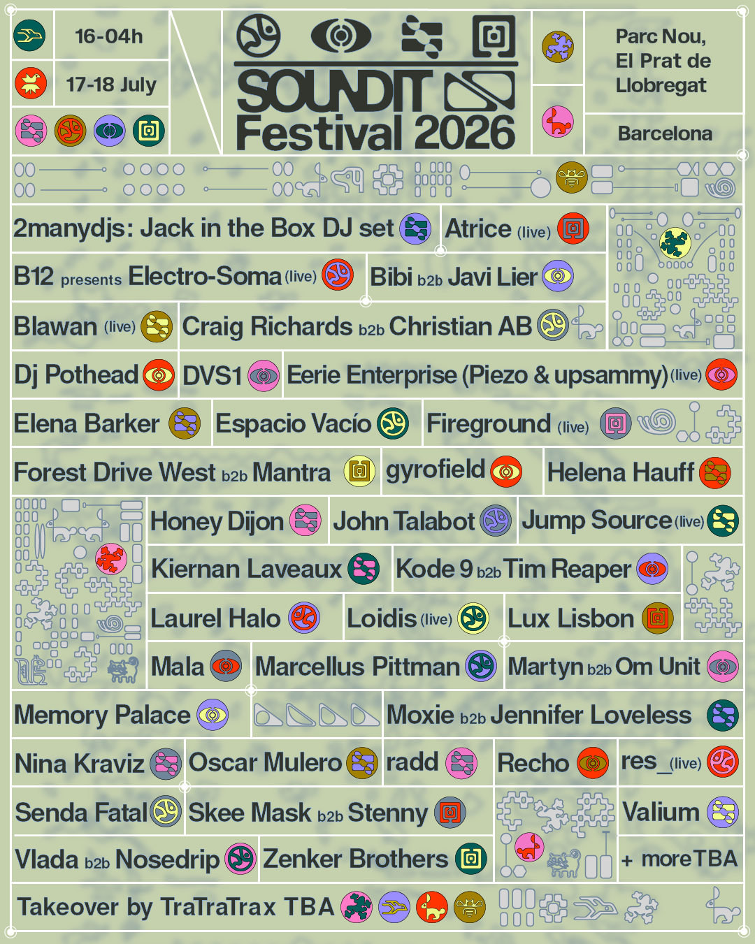 El avance inicial reúne a 32 artistas cuyos sets y directos prometen innovación y diversidad sonora. Abanderando este cartel figuran Honey Dijon, DVS1 y Oscar Mulero con su maestría en techno; Nina Kraviz con su inconfundible energía; Helena Hauff y sus sonidos crudos; y la siempre festiva versatilidad de 2manydjs en modo Jack in the Box DJ set. También destacan referentes como B12 y Mala, junto al talento local representado por John Talabot. A esto se suman las propuestas experimentales de Laurel Halo, la excelencia house de Marcellus Pittman, y encuentros como el vibrante b2b entre Moxie y Jennifer Loveless. El directo modular de Blawan pone el broche futurista a este cartel que celebra la innovación artística sin límites. Además, el sello alemán Ilian Tape se encargará del takeover del escenario Laberint.